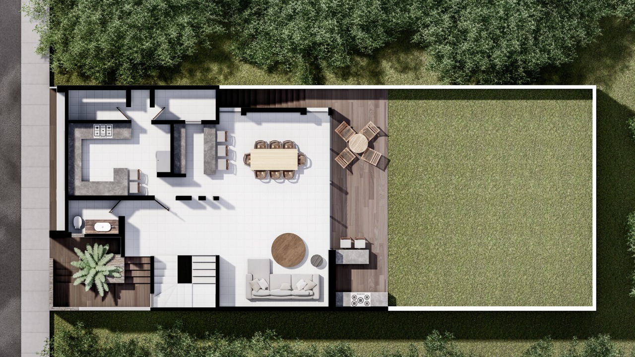 A nivel de calle cuenta con cochera para 2 autos, pasillo lateral, en 1er nivel cuenta con recibidor, medio baño de visitas, cocina, alacena, sala, comedor, patio de 80 m2, en el 2o nivel cuenta con estancia, lavandería, 3 recámaras con baño vestidor cada una